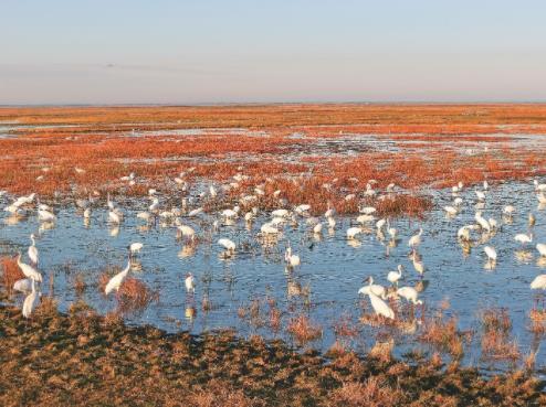 在镇赉县的多个湿地监测点,一幅幅生机勃勃的候鸟群像跃然眼前。国家一级保护动物、世界极危物种白鹤,宛如优雅的白色精灵,在湿地间欢快觅食,不时翩翩起舞,仿佛是大自然派来的使者。灰鹤的数量更是突破了3000只,它们身姿矫健,时而翱翔天际,时而低头觅食。白头鹤、白枕鹤等珍稀鹤类也纷纷亮相,为这片湿地增添了一抹神秘而珍贵的色彩。国家二级保护动物白琵鹭在当地繁殖量也逐年递增,其种群持续扩大,单次观测就能发现超千只的种群。它们整齐地排列在浅水湿地中,集体觅食的场景蔚为壮观。